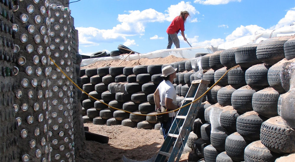 A gumiabroncsok újrahasznosítása ezekben az épületekben igazán kreatív, innovatív formát ölt: a régi abroncsokat földdel töltik meg és tömörítik, majd ezekből masszív falakat építenek. Az így készült falak kiváló hőtároló képességgel bírnak, így a ház nyáron hűvös, télen pedig meleg marad, ezáltal nagymértékben csökkentve az energiaigényt.
